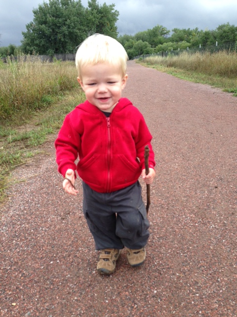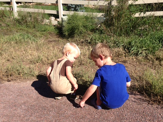 My boys, especially Caedmon, see bugs as awesome fascinations (they view rocks the same way…but that’s another post entirely). Caedmon has recently discovered beetles. Where we live we have pretty boring (and thankfully small) beetles. Just plain black beetles that crawl on the ground and don’t do much. In his eyes though, the world stops when a beetle is spotted. He will crouch down and reach out and try and touch the beetle, and then giggle and giggle as the beetle crawls away. This will go on for awhile until his attempts at touching the beetle result in him smashing the beetle (sorry bug lovers of the world, he’s 18 months, not much I can do). Since he’s young, he hasn’t figured out his own strength or the fact that the beetle is dead, but instead that it is no longer crawling away so he can now pick it up and carry it with him where ever he goes. Which is totally what makes me excited. Inevitably in his pure glee from carrying the beetle he flings it somewhere into the grass. Luckily this is where a big brother comes in handy as they both sit on the side of the trail looking for the dead beetle.