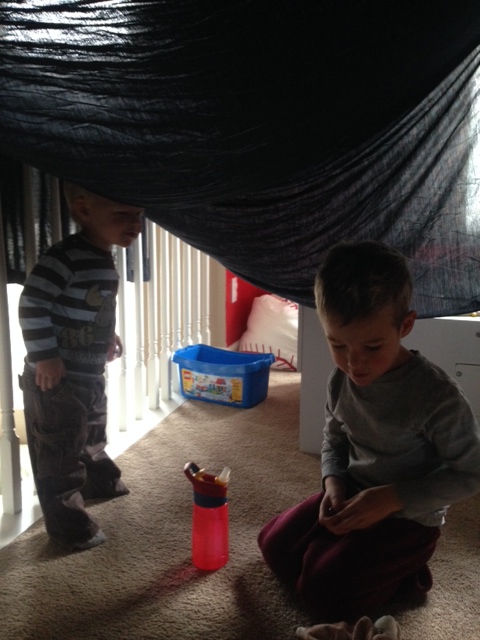 What cold day is not complete without a fort being built? I remember growing up and my brothers and I using every spare sheet and blanket that my parents had and building elaborate forts. We would make rooms and special doorways and all sorts of things out of the sheets and some chairs.
