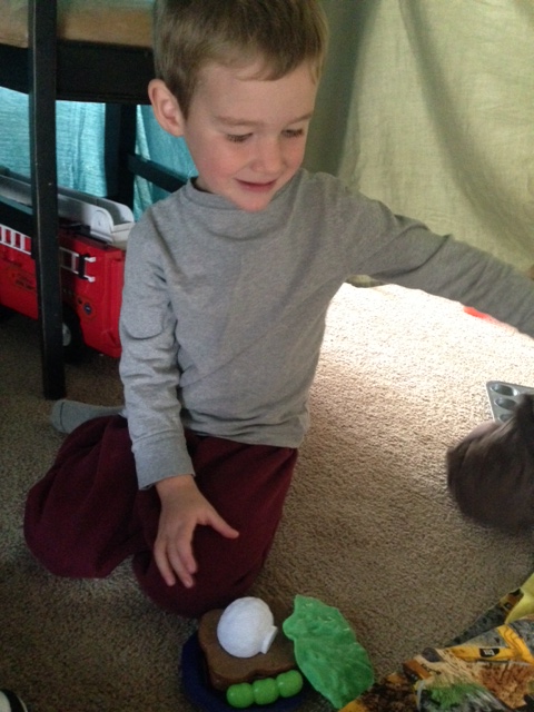 After getting the trucks all parked, the boys decided that it was bed time, so we all laid down in the fort and pretended to go to sleep. The “next morning” the boys made me breakfast. And honestly, what is possibly better for breakfast then a pea and cheese sandwich topped with cauliflower? Isn’t that everyone’s ideal breakfast?