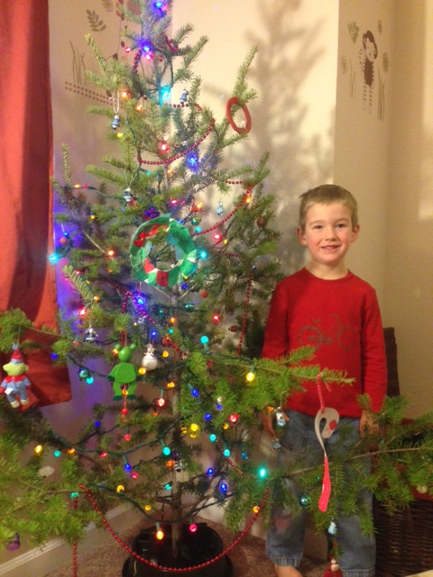 He eventually calmed down and we were able to finish putting the decorations on the tree. There are many basketballs, footballs, and baseballs as well as a spaceship ornament, a wooden frog, a sock monkey, and a wide range of other random ornaments.