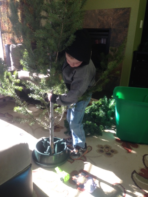 We carried it upstairs and put it in their room and then started to decorate it. The first thing was the lights of course. Caedmon became rather attached to the lights. He called them “balls” and thought they were the best thing ever. In fact he threw himself on the ground and screamed and cried when I took them away from him to put them on the tree.