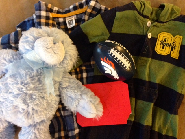 Again we are limited to a gallon size bag. I am kind of amazed at how much I can stuff in one of those bags. I chose two winter outfits that are 12 month size, based on his weight from his visit at the end of December as well as a soft bear to cuddle with and a little Broncos football. Clint and the boys had been out shopping for Broncos T shirts last week after they won the AFC championship and had trouble finding shirts but found a package of 3 little balls, so Leighton kept one, Caedmon got one and we sent one to Edric.