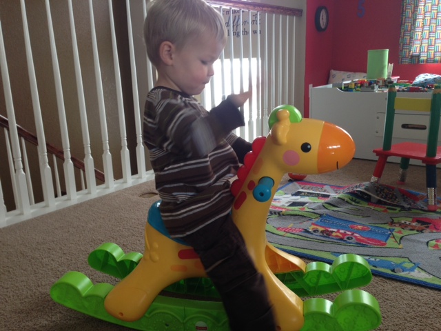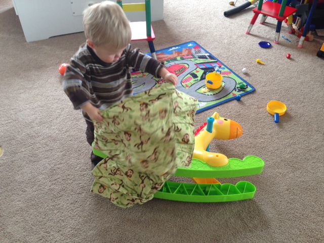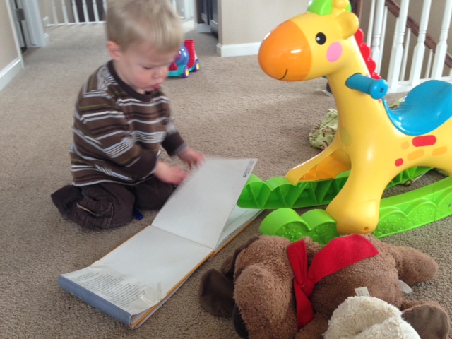 This afternoon we were playing and I love how at this stage he imitates things that he sees. He was playing with his giraffe riding toy and then decided that the giraffe might be hungry. He promptly fed the giraffe. A short while later he then decided that the giraffe was tired and needed to go “night night”. In order to go “night night” he of course needed a blanket and babies to sleep with. A short time later, Caedmon “read” a book to the giraffe. His reading mostly consisted of grabbing a book and flipping through it quickly and then tossing it aside. Hopefully that was enough reading for giraffe.