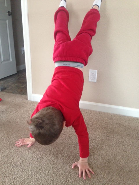 One of the things that they have been working on in his little class is handstands against the wall. To practice to see how long they can do it, they sing their ABCs. And so we’ve been practicing handstands and singing our ABCs at home as well.