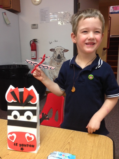 The boys entertained us with stories of their busy morning, especially finding sea shells in the sandbox outside. It was then time to do the craft. We made zebra Valentine boxes. Luckily they were all foam stickers that we just had to follow the instructions for in order to get it to actually look like a zebra in the end.