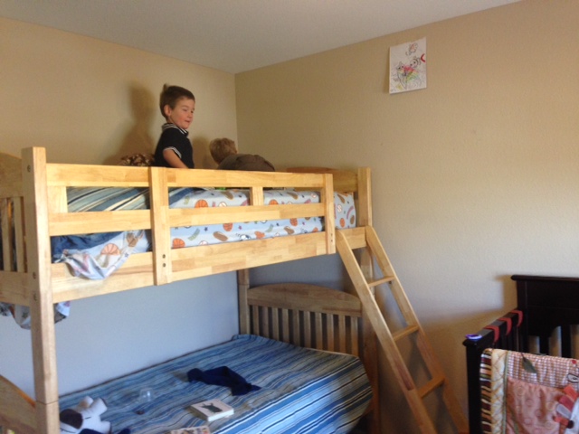 My mom made a bedspread for Leighton has blue stripes on one side and is denim on the other. She made an extra one for the other bunk and has extra material to make more for when Edric comes home. Since it was Caedmon’s room that had become their shared room, it was still decorated with his nursery stuff. It was also the same khaki color that it had been from when the house was built and we moved in 2 ½ years ago.
