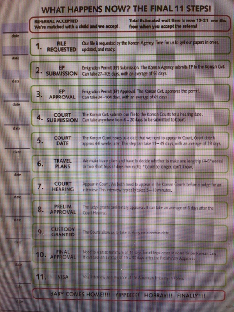 So to catch everyone up on where we are in the adoption process. It feels like its been a long time already. And it has, but in all honestly we still have a long ways to go. One of the adoption moms made the following file. Its a PDF but I’m not technical enough to figure out how to load that in to this, so I just took a photo, so I apologize if its not the clearest…