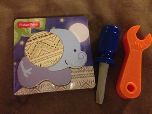 We added a little elephant puzzle as well as a couple more tools from the tool set. Not all the tools could fit in one package so we’ve slowly been sending pieces with each package, by December he should have a complete tool set.