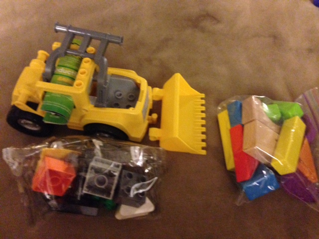 I didn’t just send clothes though. I found some Duplo lego blocks in the shape of a front loader, and both my boys have loved construction trucks. I also found some wooden blocks that I included for him