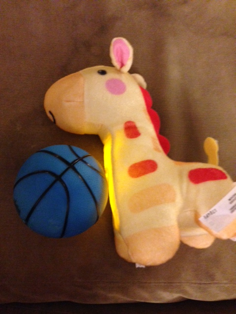 I’m a little nervous that the light-up giraffe that I found that also plays lullaby songs might sing and light it’s way all the way to Korea and will arrive with no battery life. I tried to pack it in the box so that it wouldn’t keep turning on but from time to time I could hear it playing. I also found a little glow in the dark basket ball.