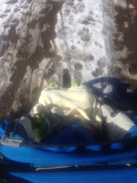 And details aside it all worked out. Granted one of the details that I had left out was that it had snowed earlier last week and so as the weather warmed up all week that snow melted, at least the snow in the sun. Which meant that the great trail was full of mud. I’m not bothered by a little mud. But it wasn’t just a little mud…it was a lot. And a jogging stroller with an almost 3 year old in it sinks in the mud. A lot.