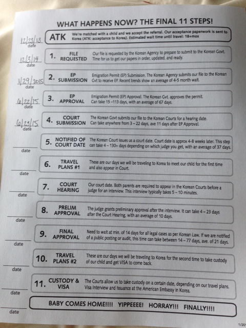 So where are we at now and what steps do we need to do to get this little guy home? On the list of 11 steps we have made it through step 4. I know, it seems like we should be so much farther 18 months after accepting the referral. The good thing is that the next number of steps often go much quicker than the first 4. Our next step will be to be notified of our court date. The group before us is getting word of their dates, and I think the average is between 40-70 days for that (I’m hoping closer to the 40!). And with that court date we will then plan our travel to Korea for our first trip. During that trip we will meet with Edric and his foster mom a couple of times and appear before the judge. We will then come home and wait for preliminary and final approvals which take 3-8 weeks. Once we have final approval we can plan our return trip, take custody, have his visa interview and fly home. I anticipate assuming things go as they have been going that we will be home sometime in October/November. So that means that the last 7 steps will take 4-5 months while the first 4 have taken 18 months. Again all that is assuming nothing weird happens, and I’ve had friends who have waited 6+ months for court dates and others that have waiting 2 months for final approval, but in general I think we are looking at another 4-5 months. Which doesn’t seem too bad!