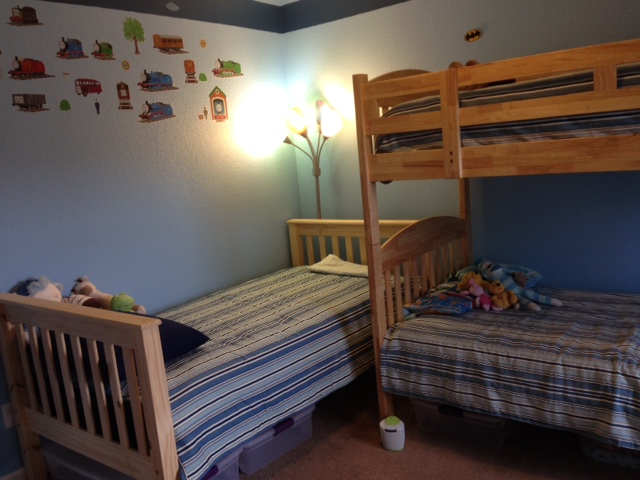We played around with having the beds go parallel in the room but it just didn’t work with the ladder. And we set up shelves with bins, one for each boy to store their treasures in (instead of under the bed). Under the bed we got a big bin of sheets and blankets to make any middle of the night changing easy and also a bin for each boy’s pjs.
