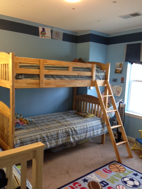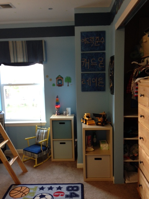 Now that we are approaching 80 weeks pregnant with Edric, assuming you don’t count the 9 months of waiting for his referral (which would put us at 120 weeks-ie 3 times the length of a pregnancy….just saying) and we have gotten his EP (exit permission) approval it was time to get his bed set up. We bought the bed last summer, we went to the same place that made the boys bunk bed and ordered a second one. The style s a bit different but all in all it matches fairly well. My mom had already made an extra bed comforter for him, so it was just a matter of buying a mattress, organizing some shelving, cleaning out all the treasures that the boys had been storing under the beds and putting everything together.