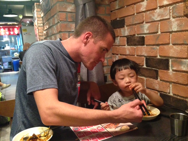 The shoes that Omma sent him in are about 3 sizes too big and when he walks it looks like a clown walking and he trips over everything. Of course the shoes we brought are just one size too small. So we asked the front desk and headed out to a store to find him some shoes. It went pretty smoothly and we found him a size that he can easily get in and have some room to grow but can walk and not fall over his own feet. And then we decided to have the dinner of champions, take out pizza and orange juice. Edric ate some pizza but more rice and kimchi and stuff that foster mom sent.
