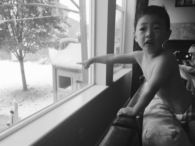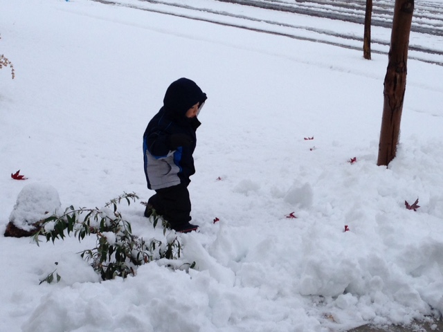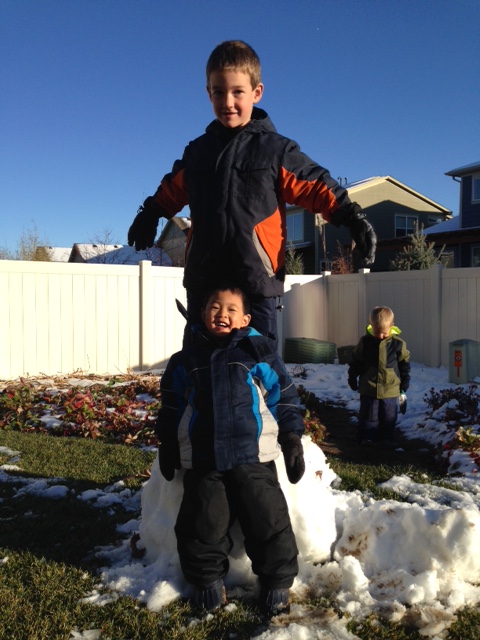 We had our first snowfall of the season this week and I think Edric was totally blown away by the snow, I’m not sure he has seen it before. The boys were all dressed in their snow suits by 8AM after breakfast and they couldn’t wait to get outside. Leighton said “I am so excited to go and shovel the snow” to which Clint said “that’s what I’m saying too buddy.” I think only one of them was actually that excited. The boys and Clint built a couple of snowmen too and then in the afternoon when it warmed up some we went back out and played some more even though a lot had melted in the backyard (thanks to facing the south).
