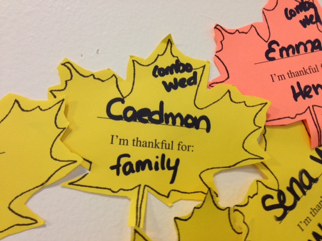 This week in their gymnastics classes the both Leighton and Caedmon had the opportunity to write on a leaf one thing that they were thankful for. All the leaves are then hung up on a tree on the wall. It is neat to stand and read what all the kids have written, everything from sunshine, to hot dogs and pizza, to clouds, to certain people, etc. Both Leighton and Caedmon, unprompted by each other or anyone else chose to write “family” as the thing that they were thankful for.