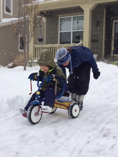 And so before long we were all in the front shoveling the driveway and side walk. That lasted for awhile but then the two little guys decided that 10 inches of snow and an icy driveway is a great time to get out their trikes and ride them up and down. Or rather ride them down and plow into the snow at the bottom and then have mommy pretend that she is a tow truck and pull them back up the driveway. So while I may not have gotten much of a run in that day, I still got a decent work out.