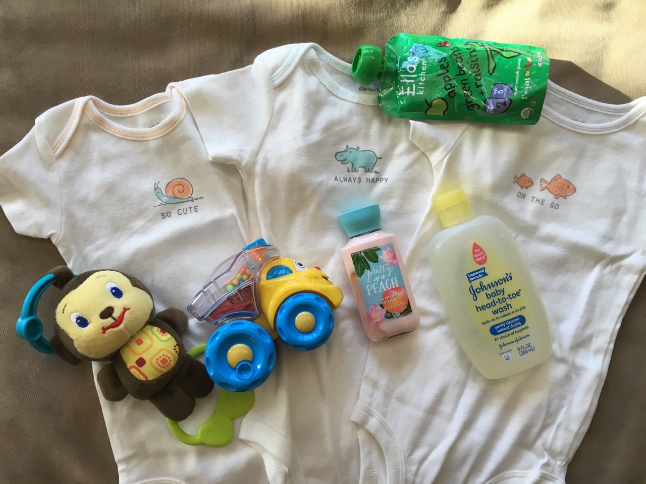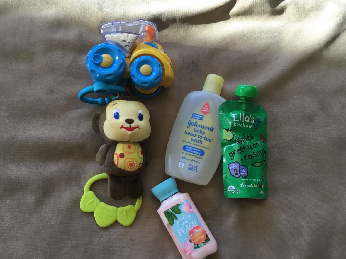 So let’s start with the fun toys. Caedmon was shopping with me at Target one day after speech while we were running errands and helped me find the little monkey that makes noises and plays music. I held up a few different toys and he chose that one as the one to get. Also sent a little truck that has beads that roll and shake around in the back part. I remember reading and learning that soaps and lotions for kiddos is on the expensive side in Korea so I included the bottle of baby soap in it. I included some baby squeezey food or whatever people call those packages of food. This one is a combo of apples, green beans and raisins, and I have to be honest, I’m not so sure that that sounds the most appetizing. And I actually didn’t get a photo of when everything was all packed up but there was enough room to include another squeezey thing as well, I’m not sure the flavor of that one. To finish it off I included a little thing of lotion for foster mom.