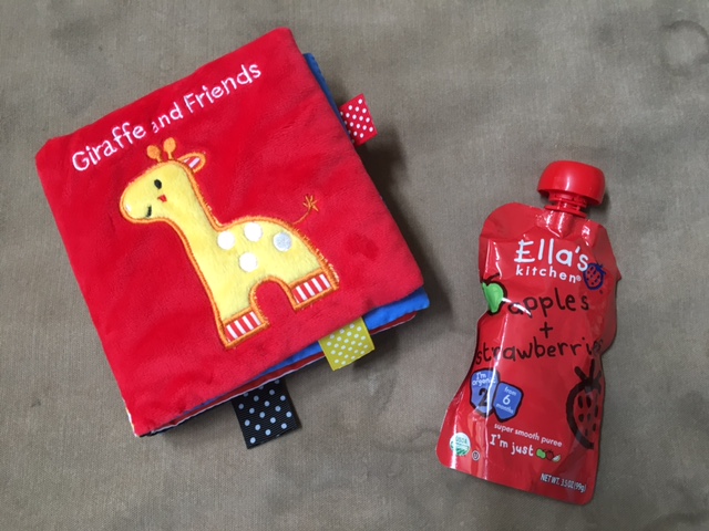 I also found this little book that has all sorts of textures and interactive things on each page. Some pages crinkle, others are soft, one has a rattle, and it’s a good interactive and sensory book. And who could pass up smashed up strawberries and apples? It sounded good to me too.