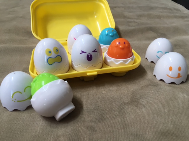 I also found this little toy that has eggs with different faces and little chicks on the inside. Not only does he have to put the tops and bottoms together to match of the chick and egg faces, but also the bottoms of the eggs each have a shape that only fits in a spot in the egg carton. I figured that its good for fine motor skill development and practice. In the photos we got of him in July he was at the agency and had opened it and was playing with it so I figure that’s at least a good sign.