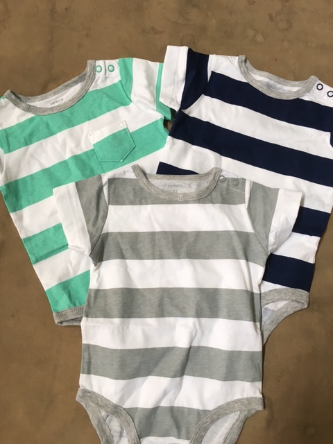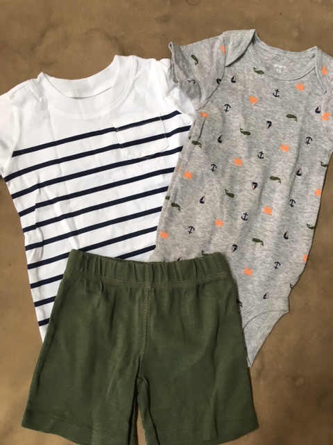 This package traveled to Paxton at the end of June and he got it during his visit in July. I had ordered some clothes this spring when they were on sale that were 12 month size and sent a few of them in this package. I learned from the video that we got of him after this had been sent that many of the outfits I sent in the spring were too small because he has a very long torso. I hope that these fit him. By looking at his weight and height that I get each month they should….but it’s hard to know for sure.