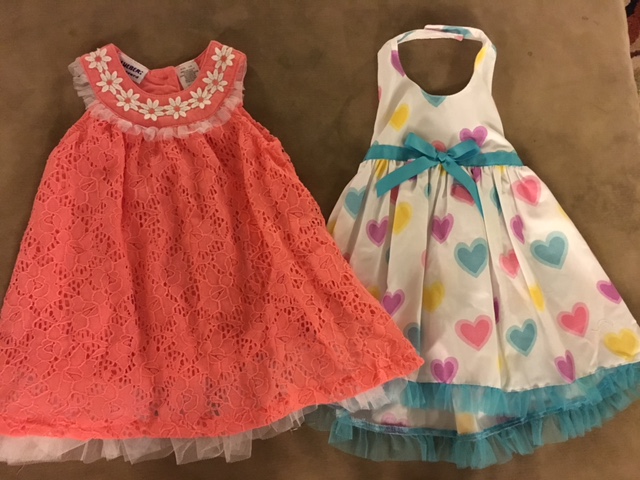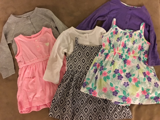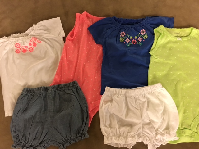 And then the clothes. Since I wasn’t exactly sure what her size is, I also don’t know exactly when she’ll be coming home, I decided to put number of different outfits of different sizes, as well as planning for the weather. I started with some nine-month short outfits that I found on sale. I hope that she can at least get a couple uses out of these.