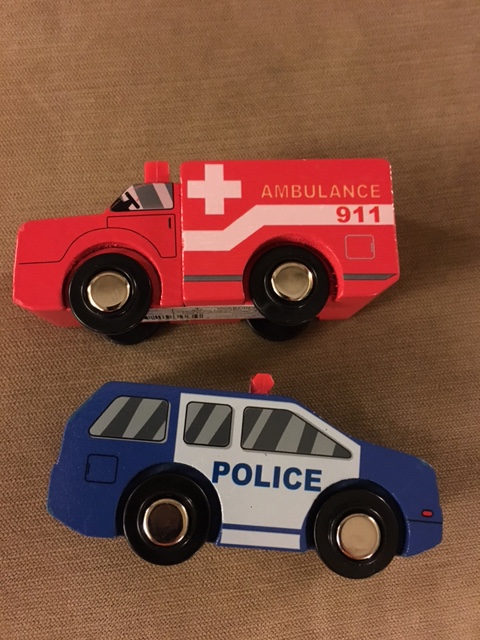 As well as a little ambulance and police car. He got a fire truck in his last package and these are just to go along with it.