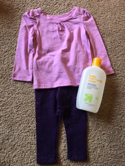 Sparkly leggings and this shirt were both on the clearance rack as well. With some baby shampoo thrown in.