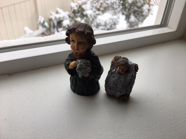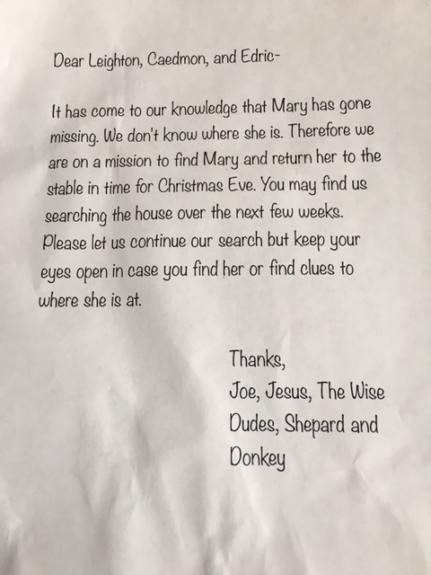 So some people do Elf on the Shelf this time of year. We never had. I kind of think the elf is creeping looking. Instead we have a missing Mary. Yes, Mary has left the stable and is missing in our house. Joseph, the wise men (for some reason we only have 2?), baby Jesus, and the shepherd (again somehow we only have one of these) and a donkey are all actively searching for her. They have spread out around the house.