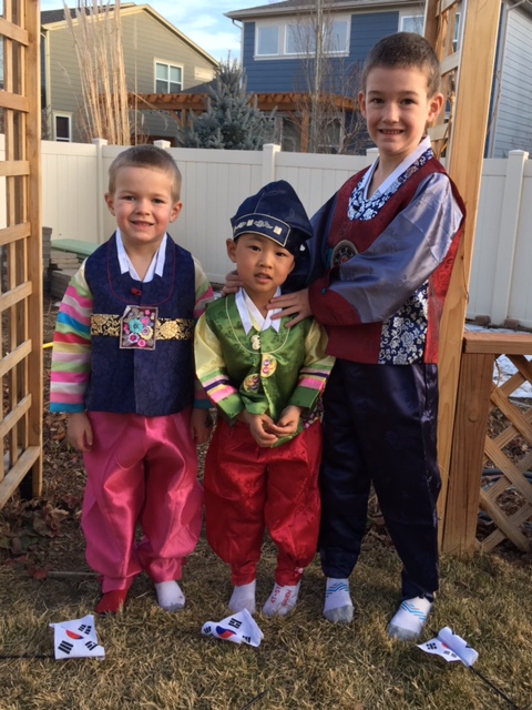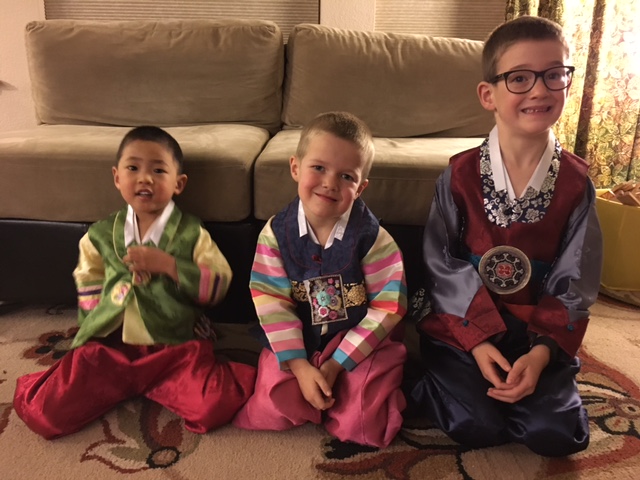 For holidays it is very typical for Koreans to wear their traditional clothing known as a hanbok. My boys actually call them their “Korean Ninja Clothes”, and asked from the time we got home from church when they could put their ninja clothes on. And once I finally relented and they put their ninja clothes on I attempted to get photos of them. I have a ton of outtakes, and a few that actually look 1/2 way decent. Oh well. I don’t have traditional shoes for them, and we only have one hat, but I’m just glad we can get the clothes on and they enjoy wearing them.