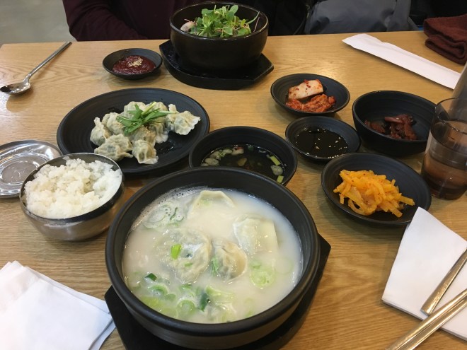 After getting the gate we walked to Dongdaemun History and Culture Park and took some photos. We were super tired and very cold at this point (we had left our hotel at 8AM and it was past 5 at this point. So luckily there were some little restaurants inside the design complex and we found a good place with bone meal soup (what I ate) and a meat and rice dish (what Clint had). We even found a little shop with Macaroons so we bought a couple of those as well.