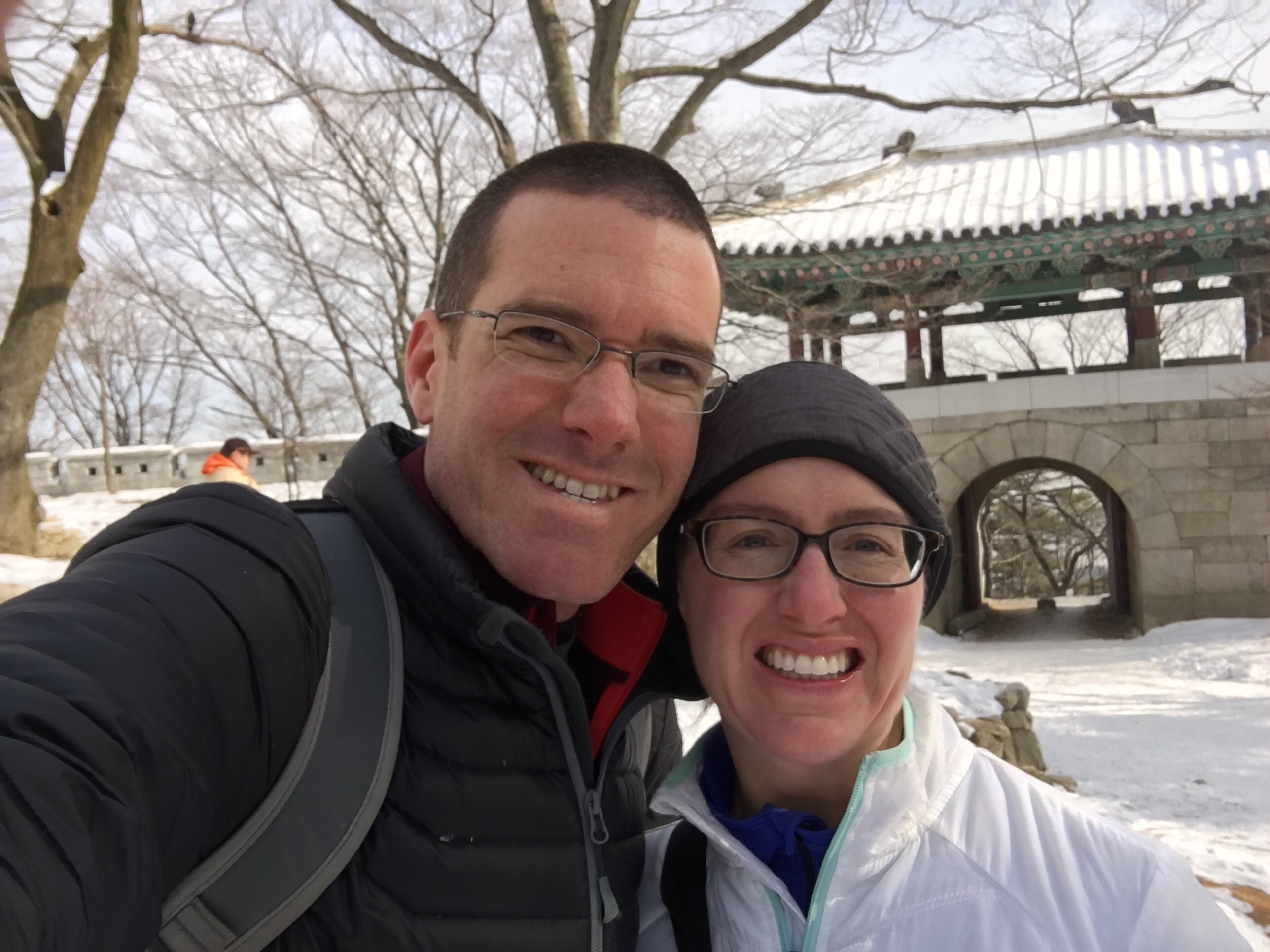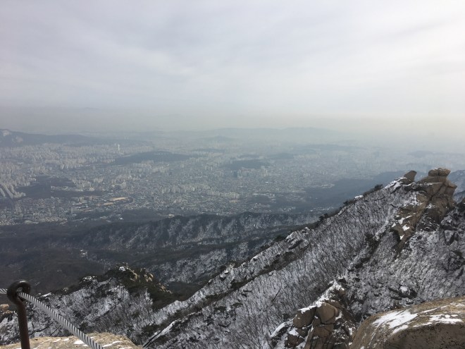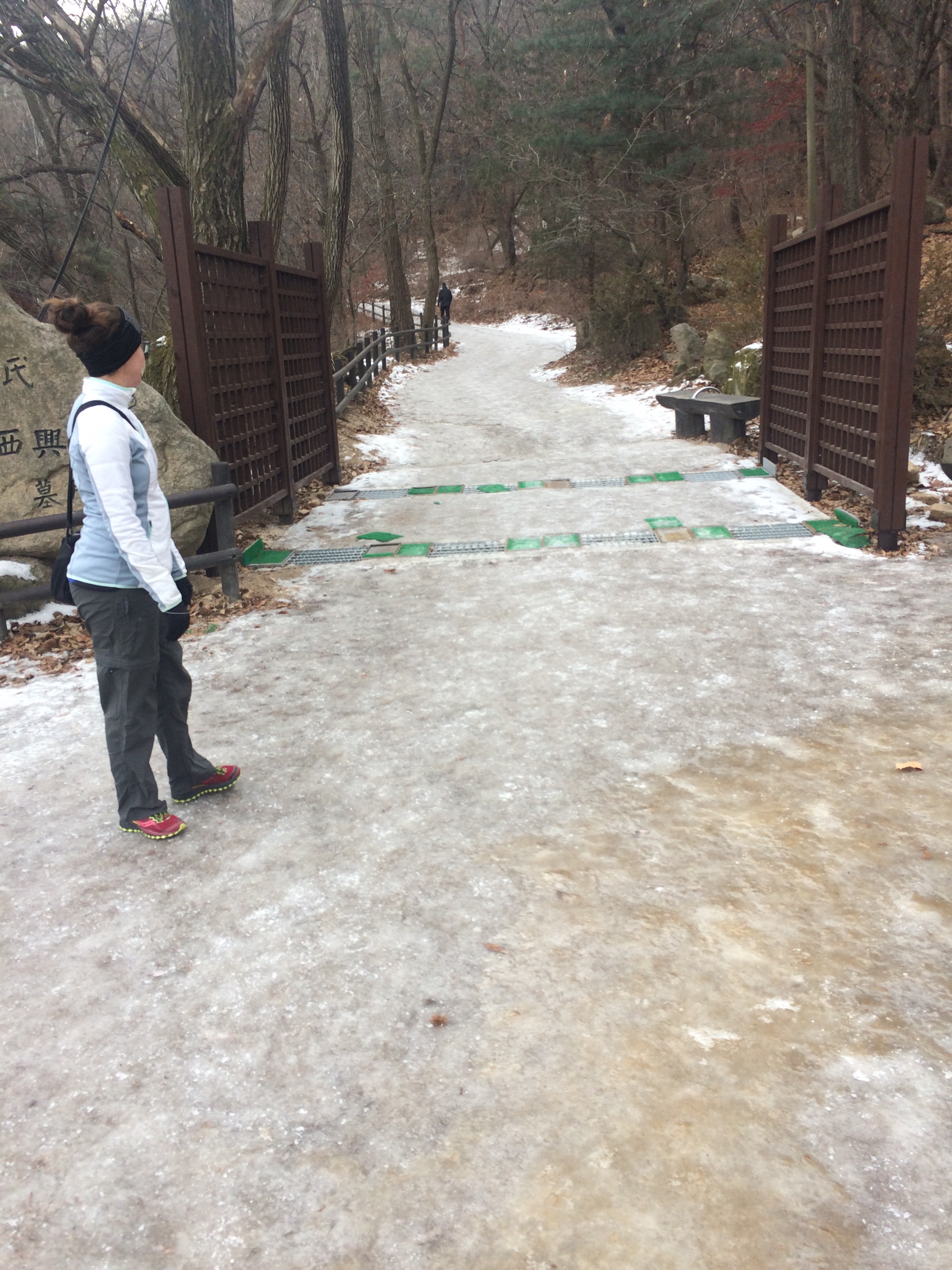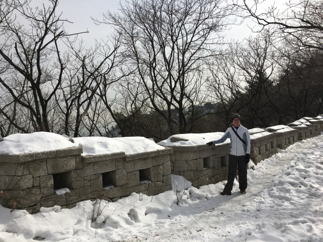 Coming down was rough, both of us ended up on our backsides a number of times. There were a few areas that were not icy but it was pretty much a sheet of ice from the top to the bottom. On the way down the other side we got to walk along part of the old city wall that goes around Seoul.