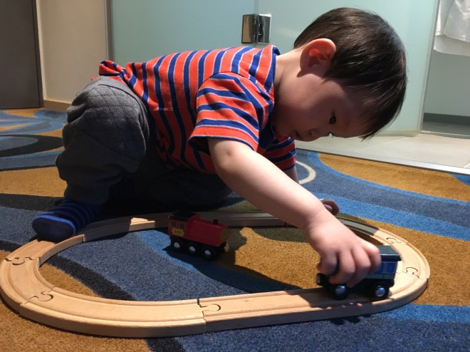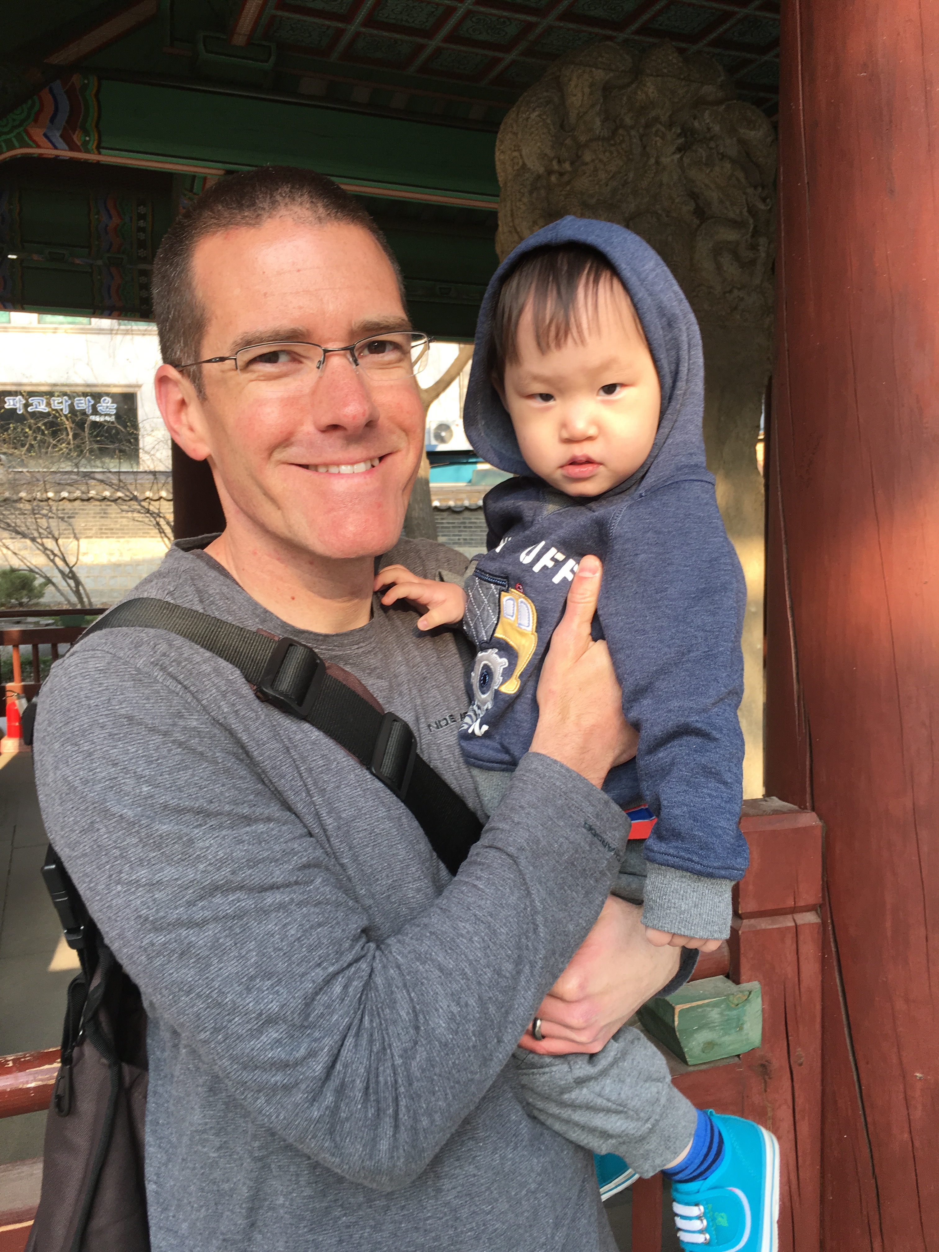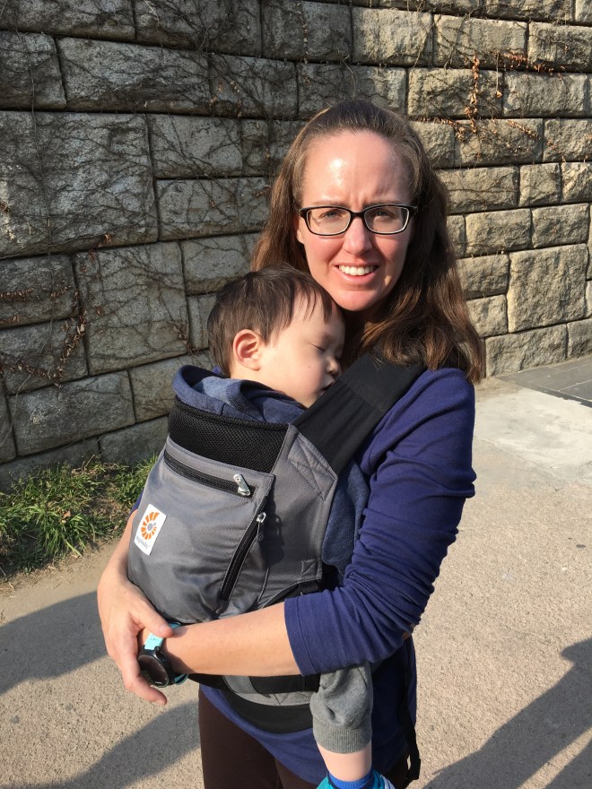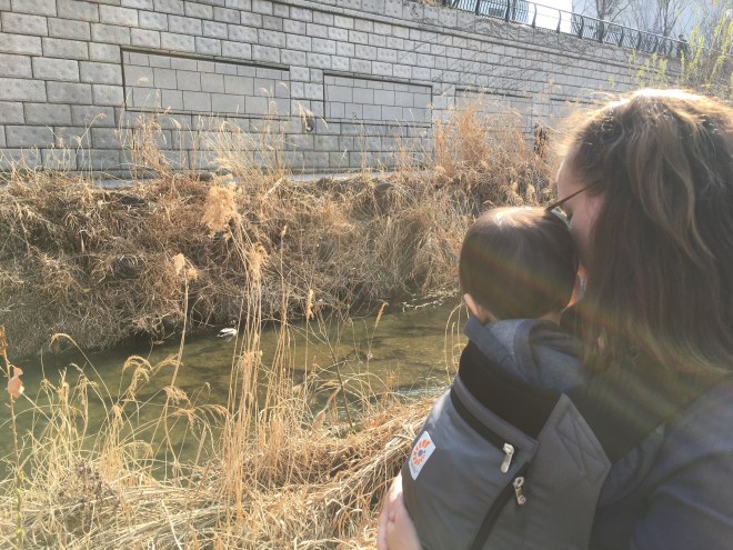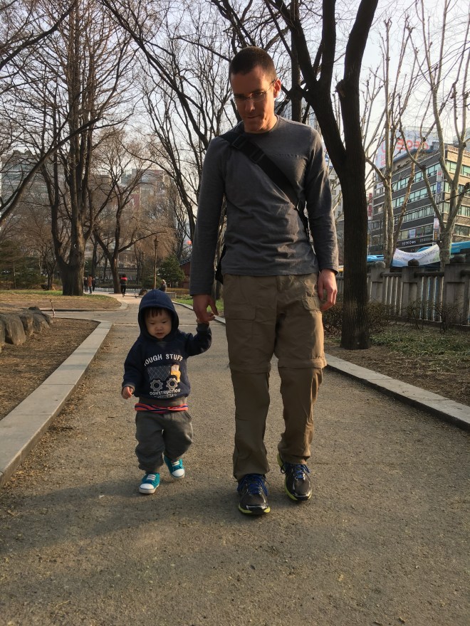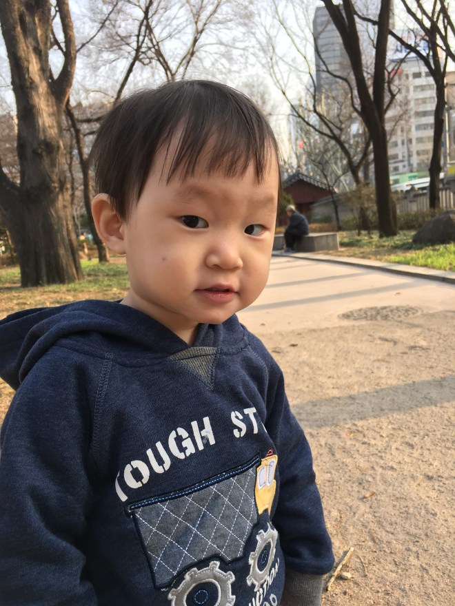 Our agency van dropped us off at our hotel. His foster family had dressed him in multiple layers and the little guy was burning up. He initially acted like he might take a nap, but that quickly turned instead into a time to jump on the bed and push the buttons to make the lights turn on and off. We gave up on the nap and loaded up in the front carrier and went down to the re-discovered stream and walked up and down it. He eventually fell asleep in the front carrier. We walked up to Insadong market and to Tapgol park where he could run around once he awoke from his 40 minute snooze. We picked up dumplings from our favorite little dumpling place as well as these yummy things that are basically fried donuts filled with warm honey. We finished the day camping out in our room eating dinner and then playing with trains. He is being one brave little boy, and has picked up his first English word, “tickle”. He loves to be tickled and has the best little giggle to go with it. I know we have tears and loss coming at some point, but for right now we are enjoying his little easy going personality and smiles and laughs.
