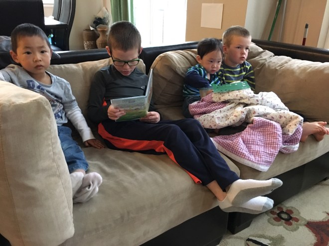 Ah, the first numbers of days home with an newly adopted toddler. Similar to being home with a newborn, but having been through both, I’d say the newly adopted toddler is tougher. And to add to the fun of the mix Paxton has his four incisor teeth coming in. Which I think for any kid are the worst ones, and seriously the poor guy needed all four coming in at the same time this week?
