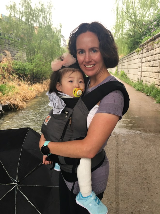 We headed to the agency and got there a little after 11, custody time was set for 11:30 but Coppelia and her foster mom and dad were already there. Coppelia recognized me but was quite happy to stay in foster mom’s arms and play with foster dad. Foster mom brought a ton of things to give to us for her. She gave us a bunch of clothes, toys, food, snacks and her hanbok. I had a photo frame with a photo from Coppelia’s first birthday with both her foster parents and a note for them thanking them for the love and care that they have given her these past number of months. They both started crying when they read it. We played a bit longer in the play room and then it was time to go. Foster mom just held her and cried and cried as did foster dad. They loaded all the bags on the elevator and then handed Coppelia Jiyun to me as we got on. She screamed and cried the whole way down and pretty much the whole 30 minute taxi ride back to our hotel. She refused to eat anything and just kept pointing at the door. She’ll go back and forth between mom and me to whoever she thinks might take her to the door and outside to go back to foster mom. We decided because she was just screaming and crying to put her in the carrier and go for a walk. She seemed to calm down a little with that, and even though it was raining we had a good walk along the stream. She finally fell asleep and so we headed back to the hotel but when I tried to lay her down she woke and started crying again. Just got her asleep in the carrier again, hopefully after a good nap she will feel a little better. I know her little heart is broken and she doesn’t understand what is going on. She was so well loved and cared for by her foster family. One day at a time, she will soon learn that we are her new and forever family.