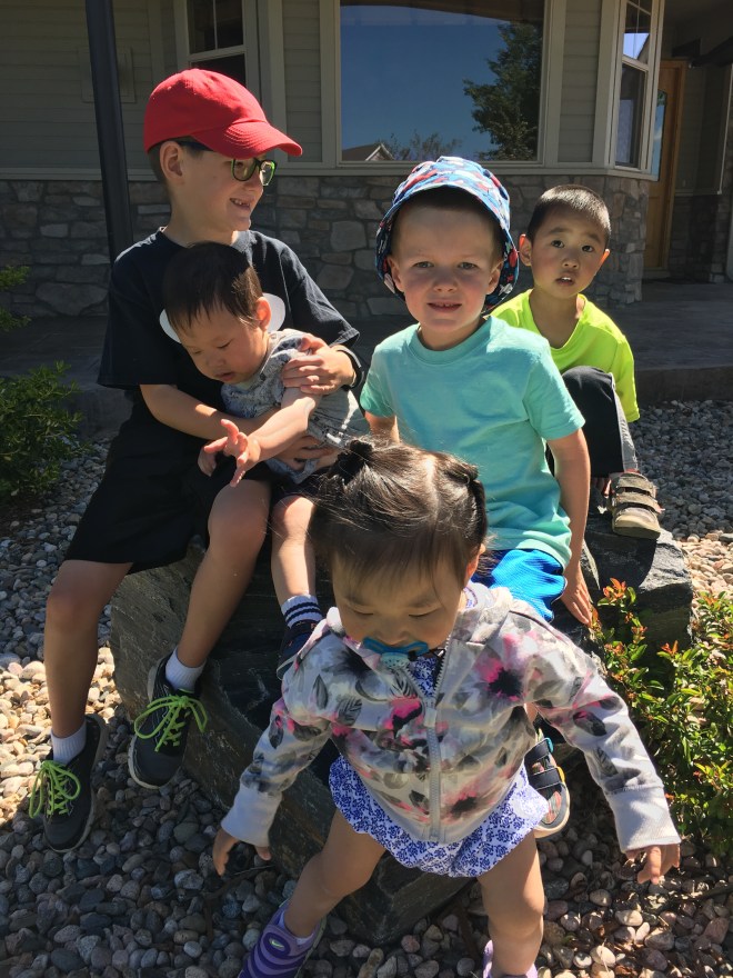 3 of them have birth moms on the other side of the world. Or Tummy Moms as we tend to call it because it’s easier to understand in little minds for now. Despite trials and rejection those women carried, nourished, and brought forth and gave life to my children despite the pain and separation and hurt that it caused and causes them to this day. And then 4 of them have the NICU nurses that cared for them during the first critical days of their lives and were the first to hold them before anyone else…they swaddled and cared for 4 of my babies either because I was 1/2 way around the world or because those nurses told me to take a step away and go for a walk and leave my little one in their care. For 3 of my littles there are also the countless volunteers in the babies homes where they spent their first few months. And then there are the three sweet and dear foster families that fed, rocked, wiped tears and little butts, held close and taught and showed and lived out love and trust and connection. And the sweet social workers who worked long hours and then spent many sleepless nights hoping and praying for families for each little one in their care. And the adoption agencies on this side of the world who answered multiple emails and phone calls and answered questions and encouraged and supported each step of the way. And so it is because each of these women that I have the awesome (and often overwhelming) title of mom in each of their 5 little worlds. And I am humbled and constantly going to my knees to ask for the strength and wisdom that I need to make it each moment of the day. Although I am pretty sure chocolate was invented by a mother dealing with an ornery 4 year old…I’m sure she (like I have been known to do this past week) instead of going first to whatever the new issue is….(i.e. Playing in the fish tank, hanging from the railings on the stairs, destroying yet something else of one of his brothers, etc etc etc) she instead went to the closest and closed the door and ate a handful of chocolate.