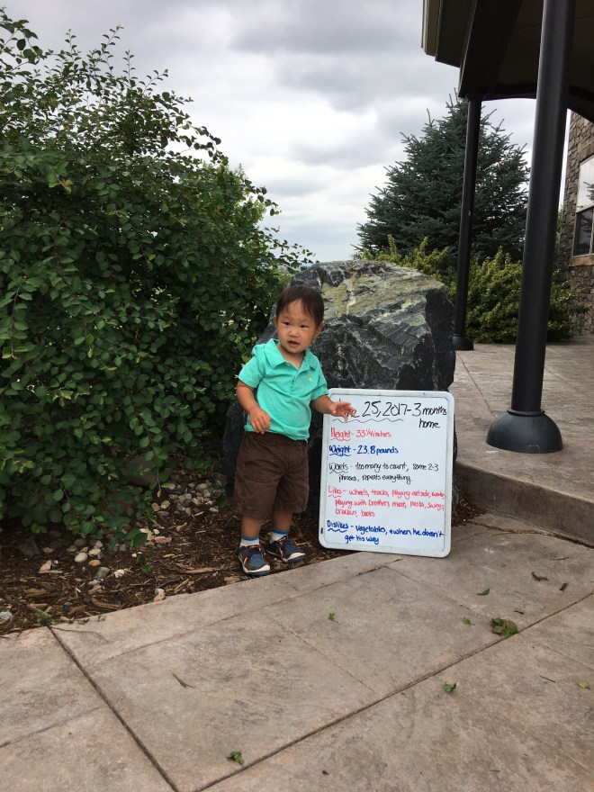 Paxton has been home 3 months (and a few days because I’m a couple days late posting as usual). He is talking up a storm and repeating things and initiating his own sentences and saying all sorts of things. Some things are still in Korean, like earlier today he was looking at a book with Clint and there was a butterfly and he clearly said the word for butterfly in Korean, but he’s using a ton of English as well.