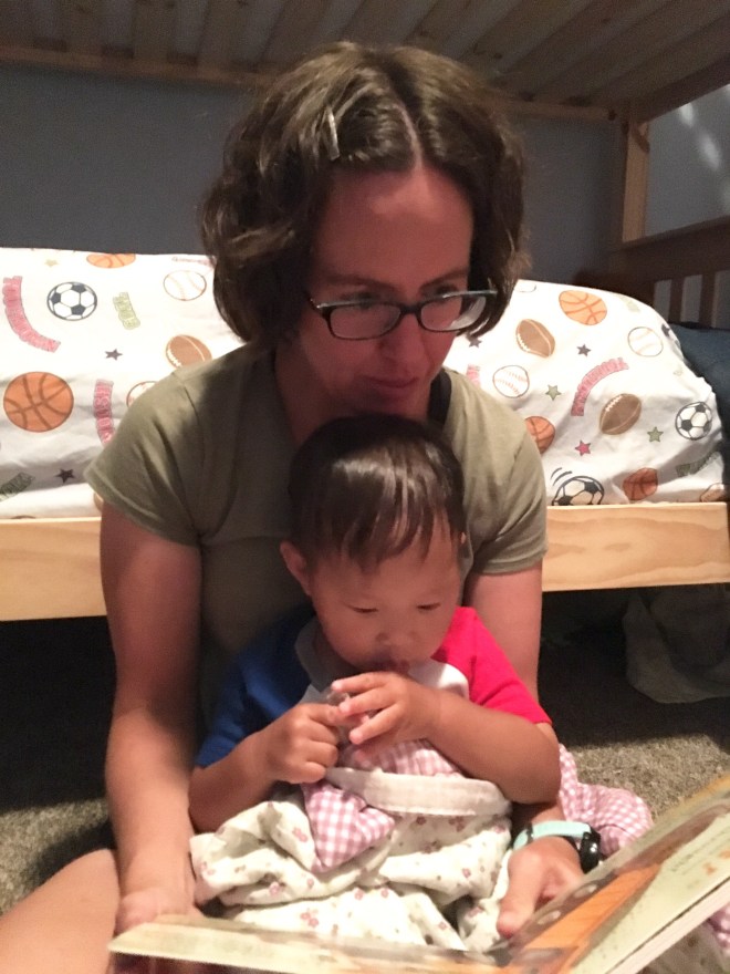 He is attaching well as well. He looks for Clint and I and is often giving hugs and comes to us for comfort. He still loves his blankie from Korea but I think that will always be something special to him, but he is allowing Clint and I to offer and give him comfort as well as looking to that for his comfort. Having a routine has helped a ton with helping him feel secure, and he has the bedtime routine down and loves to crawl into one of our laps and read books before bedtime with him.