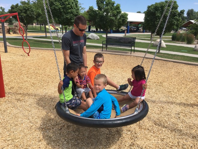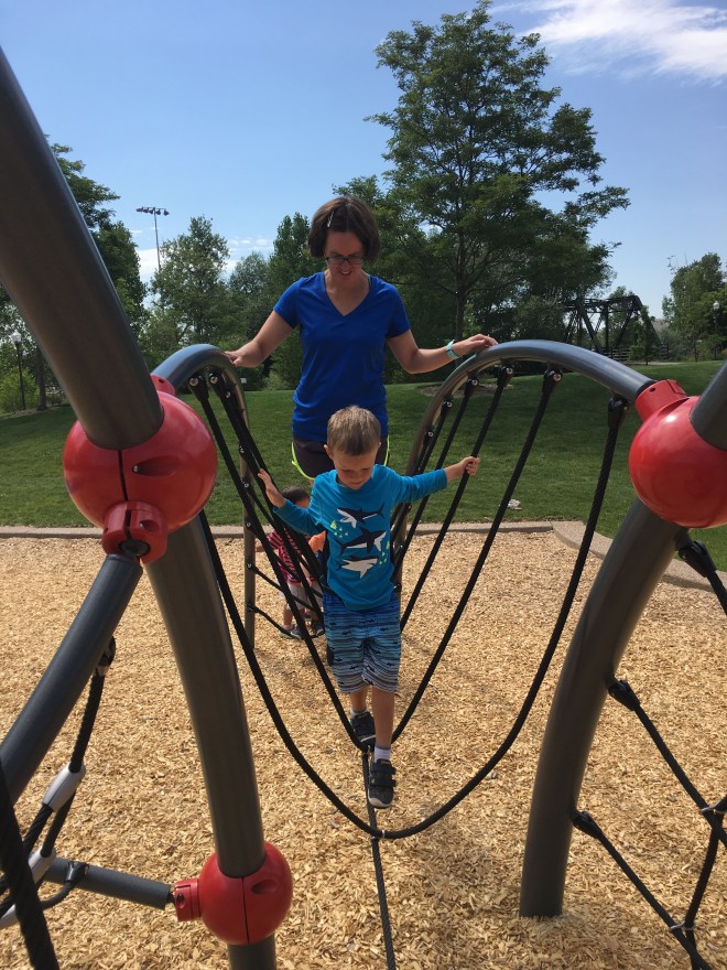 We eventually made it the 2.5 miles up the trail to the community park area that has some playgrounds and a splash pad. I kind of expected the kids to head for the water because it was hot, but they actually all headed to the far park which was set up kind of like a obstacle course. We all took turns climbing and swinging and attempting to make our way through the obstacles. We had a lot of fun and laughed a lot.