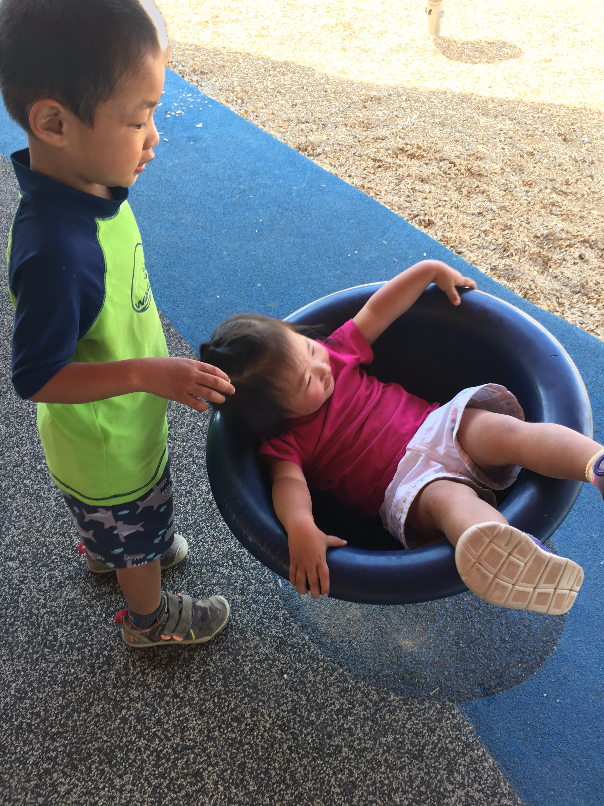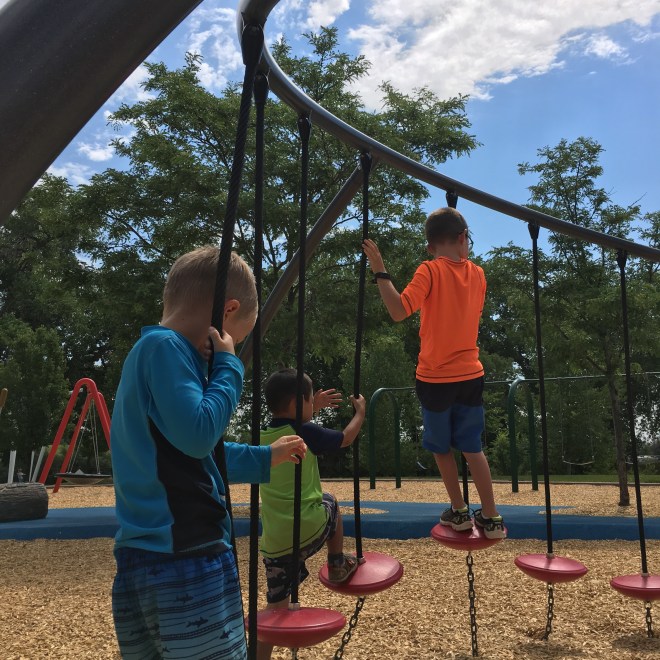We eventually made it the 2.5 miles up the trail to the community park area that has some playgrounds and a splash pad. I kind of expected the kids to head for the water because it was hot, but they actually all headed to the far park which was set up kind of like a obstacle course. We all took turns climbing and swinging and attempting to make our way through the obstacles. We had a lot of fun and laughed a lot.