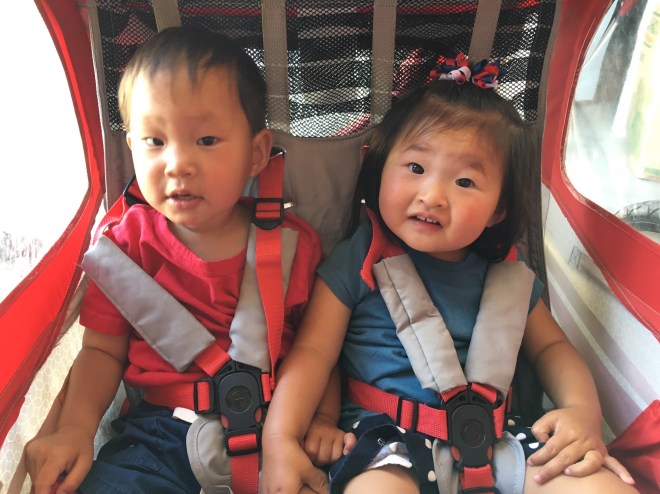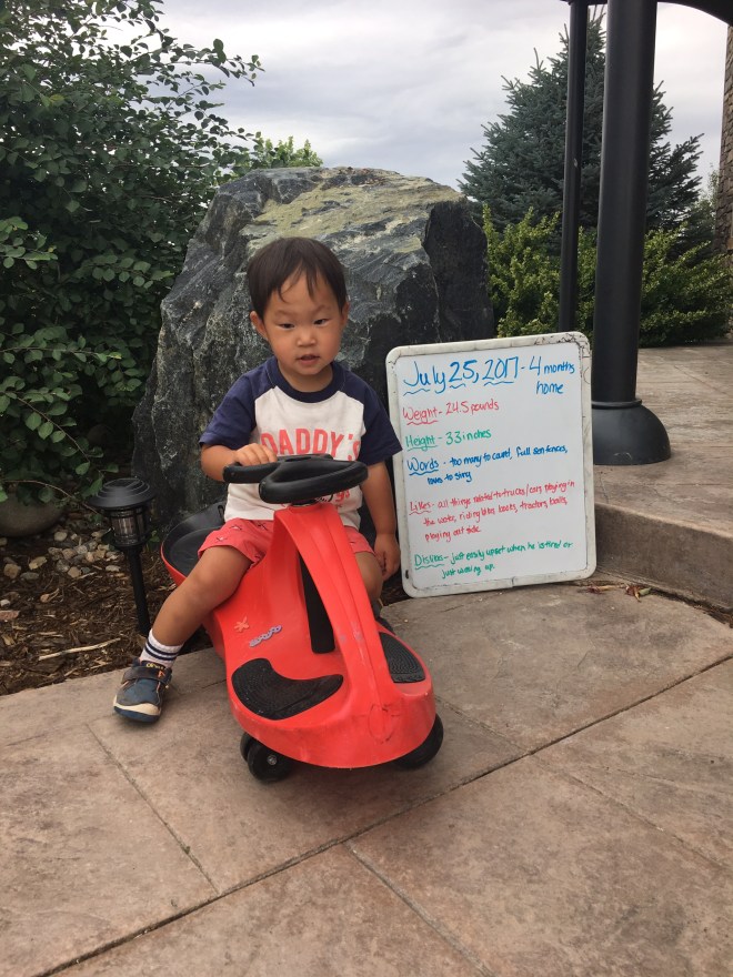 And this boy talks up a storm. In full sentences. Saying things like “I want a crouton” Because 2 year olds who are learning their second language say that all the time right? “I need to ride my bike”, “Mommy, green tractor there” are just a few other sentences this little guy speaks. But if we go out in public or there are other people around or people come over….he will hardly say anything. Also he has held on to some Korean, for example he calls Clint- “Abeoji-mommy” which is the formal way of saying “father” in Korean, and then mommy added on. Clint keeps trying to get him to call him daddy…but he remains “Abeoji-mommy”.