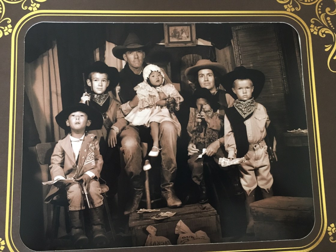 We also did a family photo at one of those places where you dress up like a cowboy or saloon girl. I vetoed being a saloon girl and so we were all made bank robbers. I hope the poor lady that got us all dressed and arranged got a bonus that day. I think she had plans to take a number of different photos in order for us to pick out the best one….she only got three shots off before mayhem ensued (complete with Coppelia throwing herself on the ground and kicking and screaming.) She wanted to know if we wanted to wait a few minutes and try again….at that point we said no, we would just take whatever was the best of the three she got. The first had Coppelia screaming and lunging off of Clint, the second had all of us recovering from that and the third is what we went with…I was trying not to laugh, Caedmon’s vest was falling off, Edric’s bandana had fallen off and Paxton appears to be shooting himself in the head with his gun. And you know what? It was perfect.