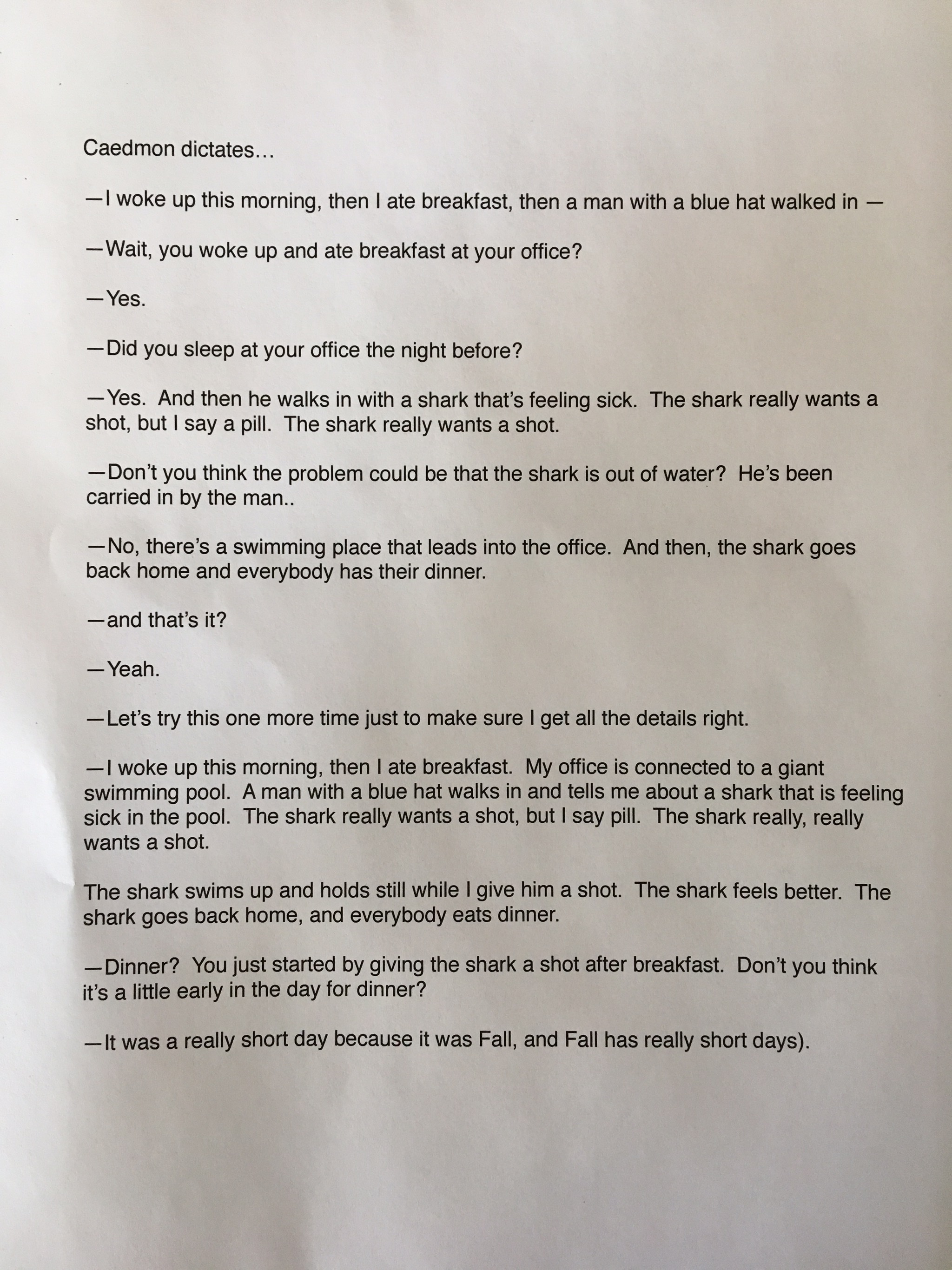 During homeschool last week Caedmon was suppose to dictate a story to Clint about a vet and the interesting animals that the vet takes care of and what a day being that vet would be like. Clint ended up typing out the whole conversation because it was so funny. Check it out below-