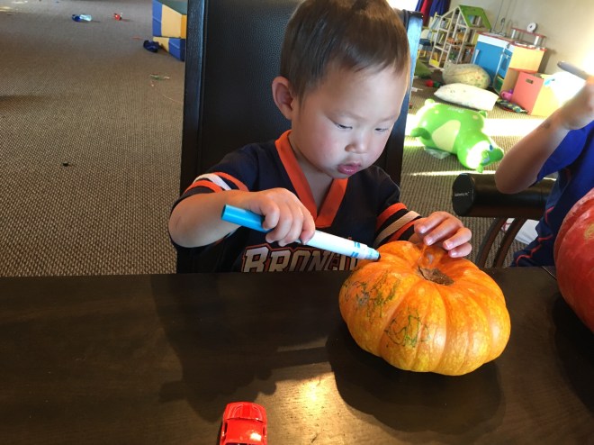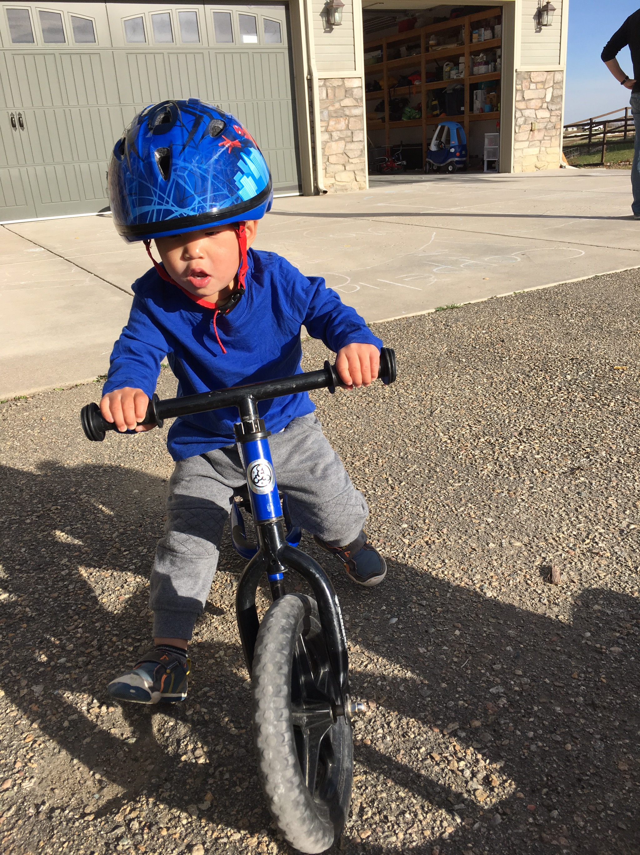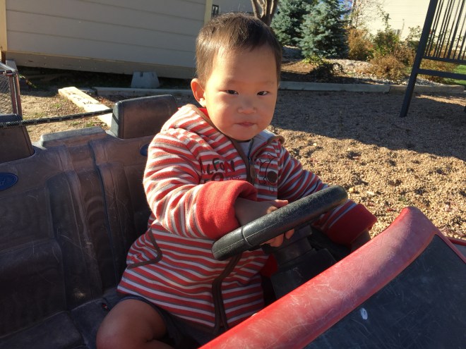 Paxton loves playing outside. He loves playing and riding in the red truck. He also loves riding his little strider bike. He has got amazing balance and I think if the bike had petals he would be petaling along by now. We spend a lot of time outside and so far this fall we have had really nice weather…I think that will change soon but we will still maximize our time outside with lots of layers on. He also loves reading “Goodnight Goodnight Construction Site” and whispers to each of the trucks in the book as they go to sleep.