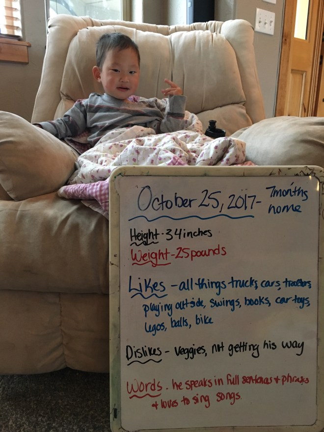 Last week we celebrated Paxton being home for 7 months. The weather was not very nice outside and he was rather crabby from his nap when he woke up so we took the photo inside.
