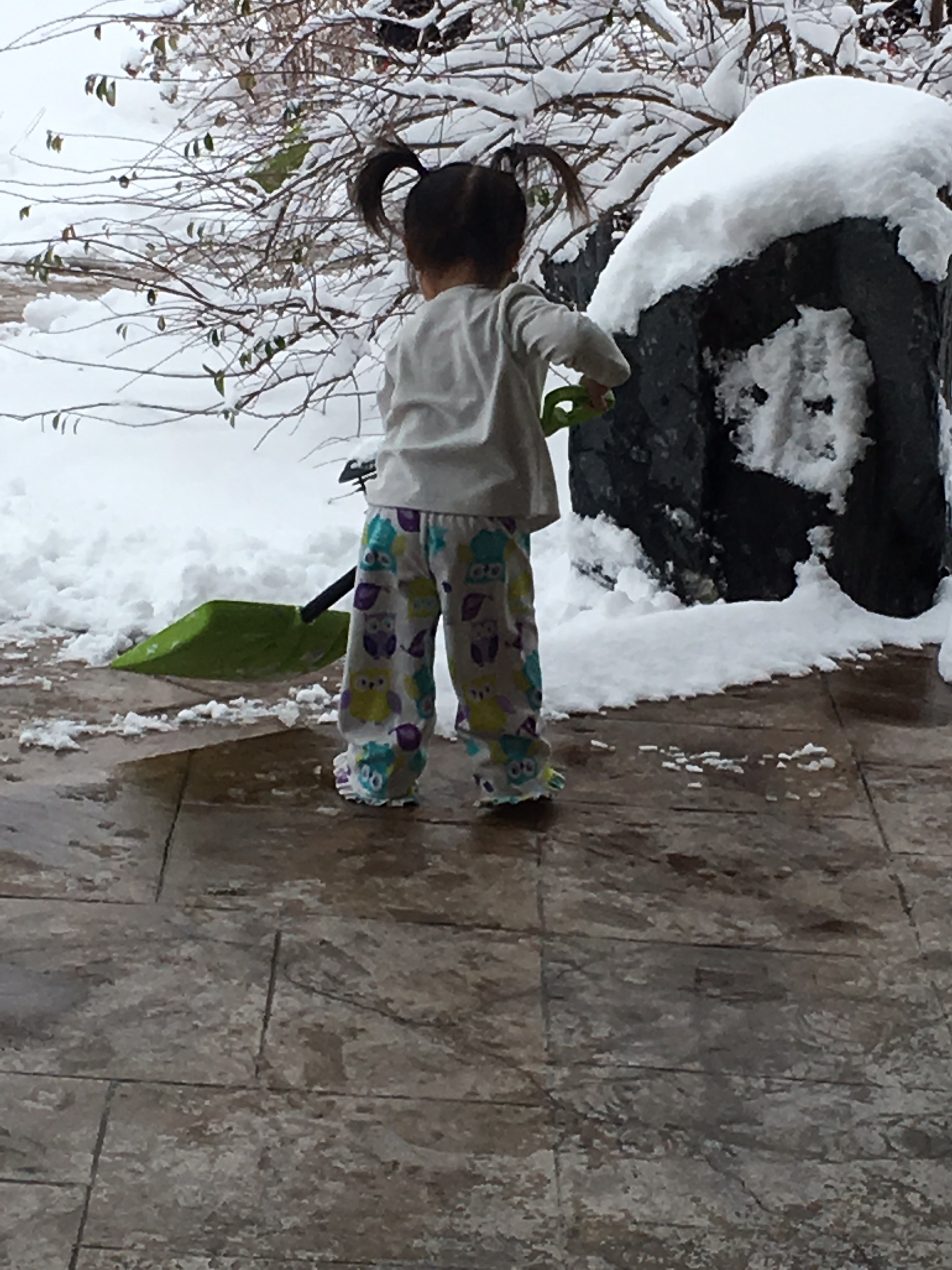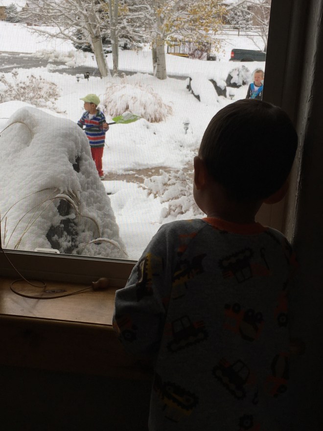 But enough on that. It was going to snow for most of the morning so we started in on school work and such and decided that we would go outside and shovel the driveway after lunch. However my dad who lives super close had other plans and showed up mid morning with his four wheeler to clear our driveway. I was grateful because our new house has a much larger and longer driveway and figured we’d be out there forever shoveling. The kids think shoveling the snow is one of the best things ever though, but still it was going to be a long time shoveling. The kids saw my dad and quickly threw on shoes and grabbed shovels to do the sidewalks. Somehow Coppelia managed to get outside without her shoes on (with 5 kiddos I can’t always keep everyone straight). She didn’t seem to mind initially and grabbed a shovel to start shoveling but it only lasted a few minutes before she was standing at the door yelling “cold!”. Paxton seemed to have the right idea…he chose to watch everyone from the window.