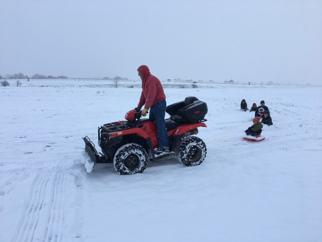 Later that afternoon though my dad returned with the 4-wheeler and a bunch fo sleds. We sledded for a good hour at least behind the 4-wheeler and honestly I’m not sure who had more fun, all of us or my dad.