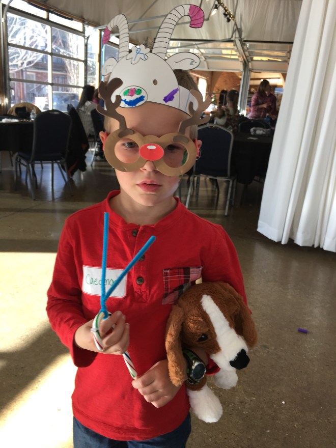 And his confidence. He strongly believes he is all that and then some. We had an adoption agency holiday party this past weekend and I was helping the kids make crafts, get their faces painted and trying hard to keep track of all 5. Caedmon walked up all decked out in a reindeer hat, Rudolf foam glasses, face paint on his cheek totally rocking all forms of Christmas fashion.