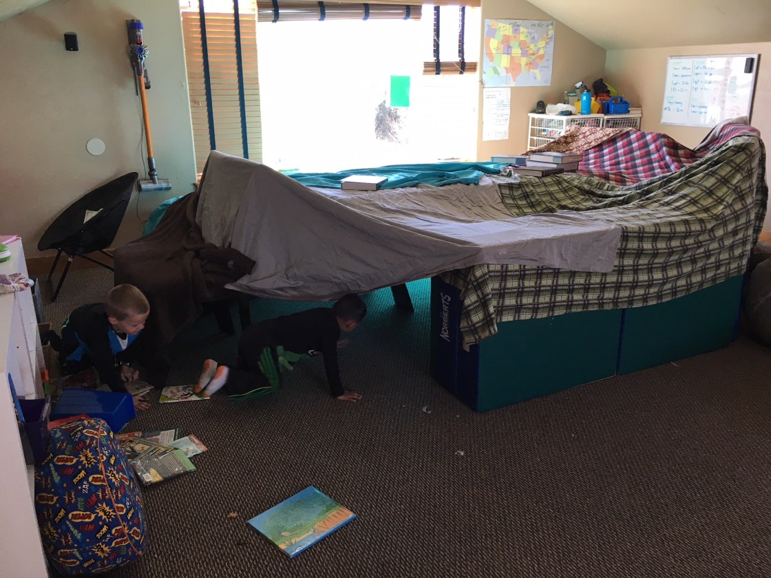 The kids loved it. I moved the table, added extensions to it, used chairs and gymnastics mats, pulled out blankets and sheets and used heavy medical textbooks to keep everything in place. I finished and they all climbed in and grabbed books and thought it was awesome.